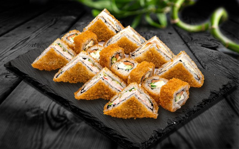 Горячий сет из 3 роллов: Жареный Треугольник с креветками, Жареный Треугольник с курицей и Жареный ролл с лососем
