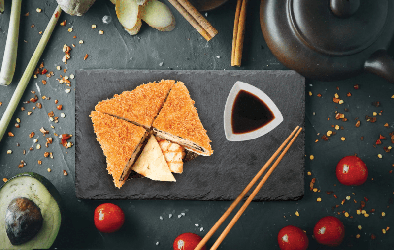 Увеличенный горячий треугольник с куриным филе и ананасом В порцию входит соевый соус. Васаби и имбирь заказываются дополнительно.