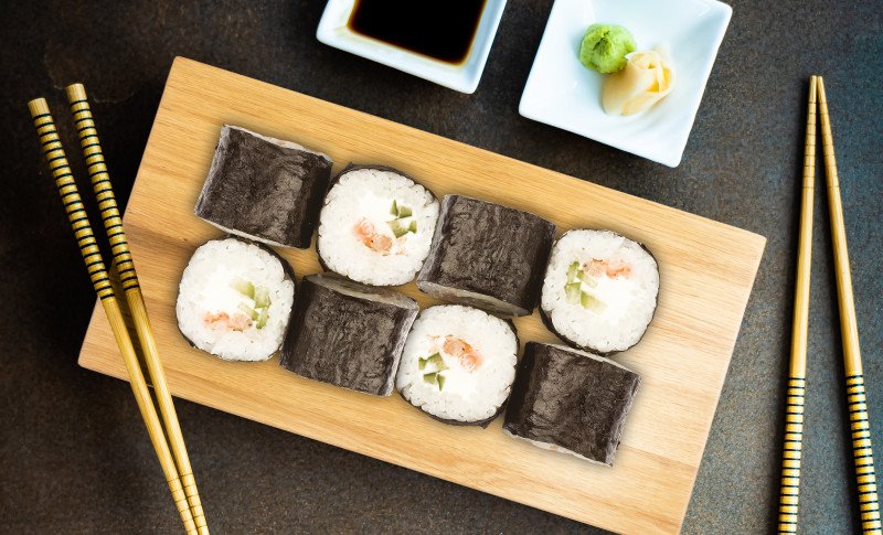 Простой ролл с креветкой, сливочным сыром и свежим огурцом. В порцию входит соевый соус. Васаби и имбирь заказываются дополнительно.