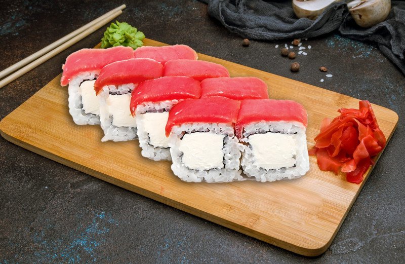 тунец, сливочный сыр В порцию входит соевый соус. Васаби и имбирь заказываются дополнительно