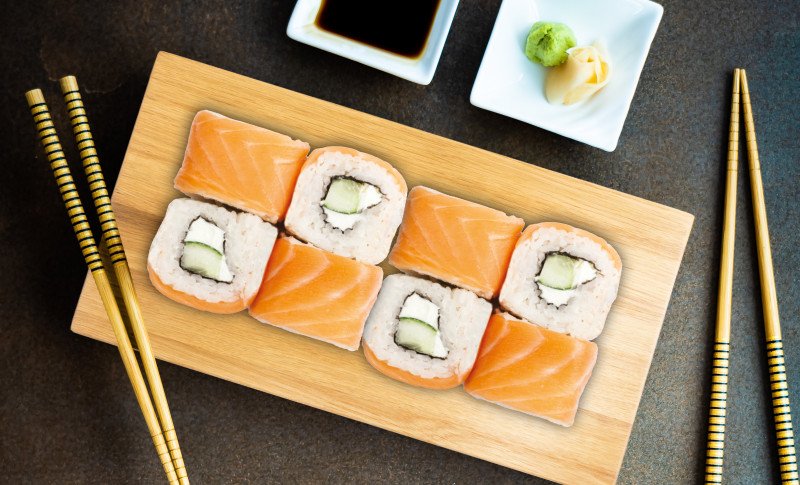 Нежный лосось, сливочный сыр, свежий огурец. В порцию входит соевый соус. Васаби и имбирь заказываются дополнительно.