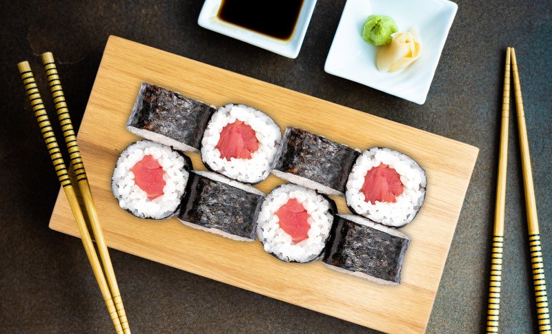 простой ролл с тунцом В порцию входит соевый соус. Васаби и имбирь заказываются дополнительно