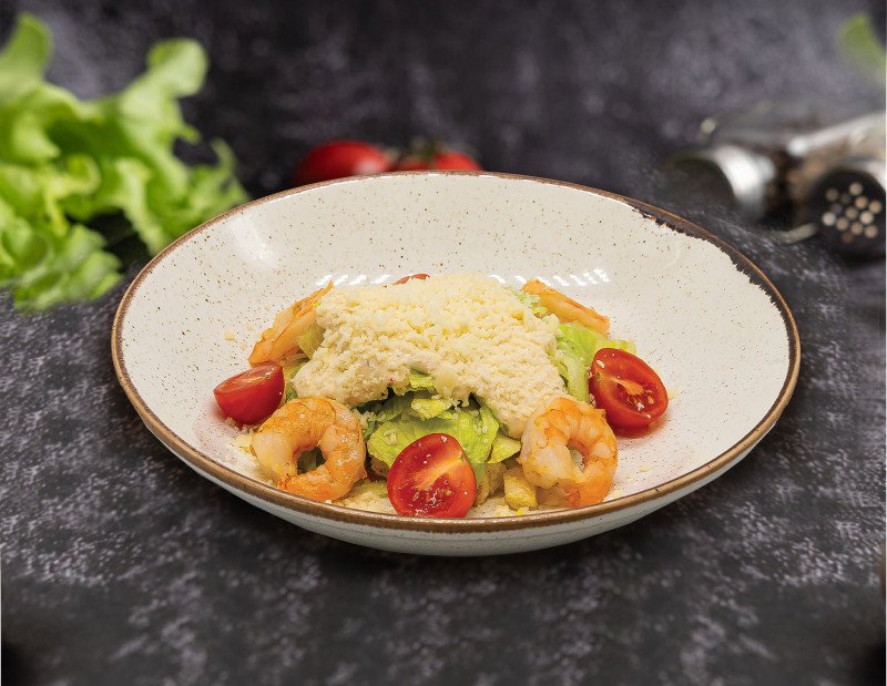 Классический салат с королевскими креветками, салатом, томатами, пармезаном и соусом Цезарь.